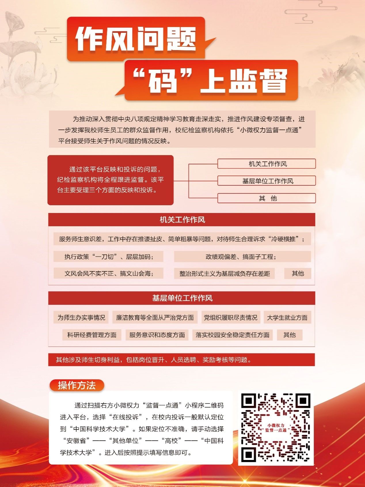 为推动深入贯彻中央八项规定精神学习教育走深走实,推进作风建设专项督查,进一步发挥我校师生员工的群众监督作用,校纪检监察机构依托中央纪委国家监委主管、安徽省纪委监委主办的“小微权力监督一点通”平台接受师生关于作风问题的情况反映。